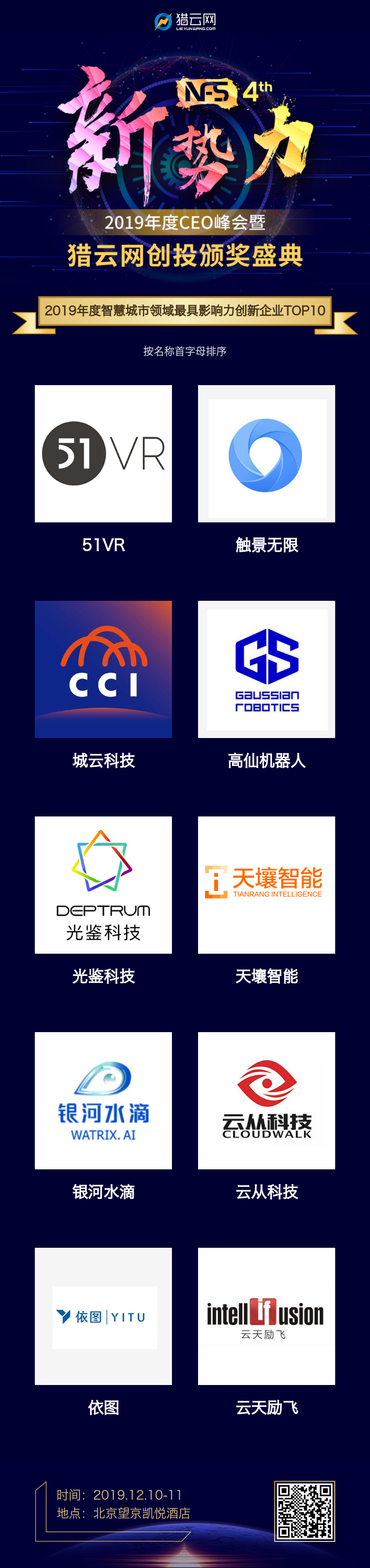 今日,猎云网在“新势力·2019年度CEO峰会暨猎云网创投颁奖盛典”上颁布了2019「年度智慧城市领域最具影响力创新企业TOP 10」榜单。