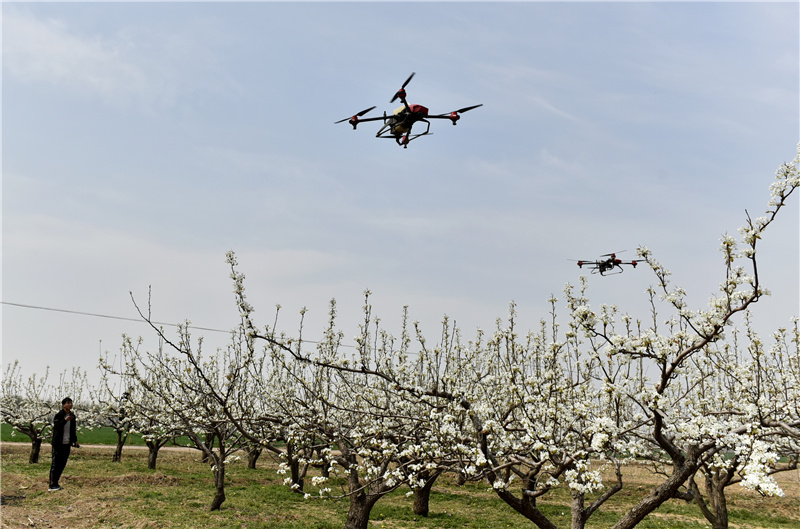 4月6日,工作人员在河北沧州泊头市洼里王镇芦庄村梨园操作无人机给梨树授粉。